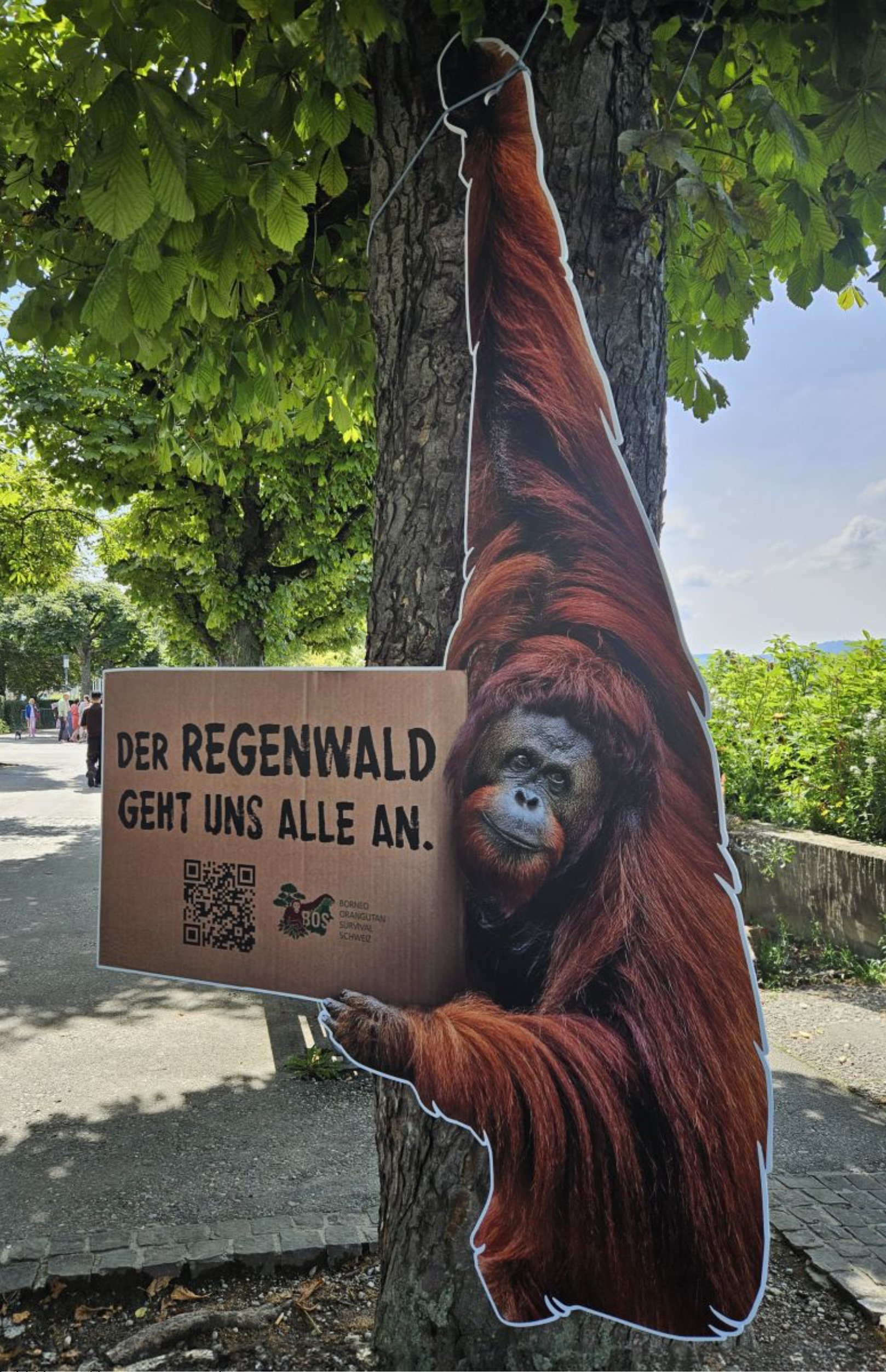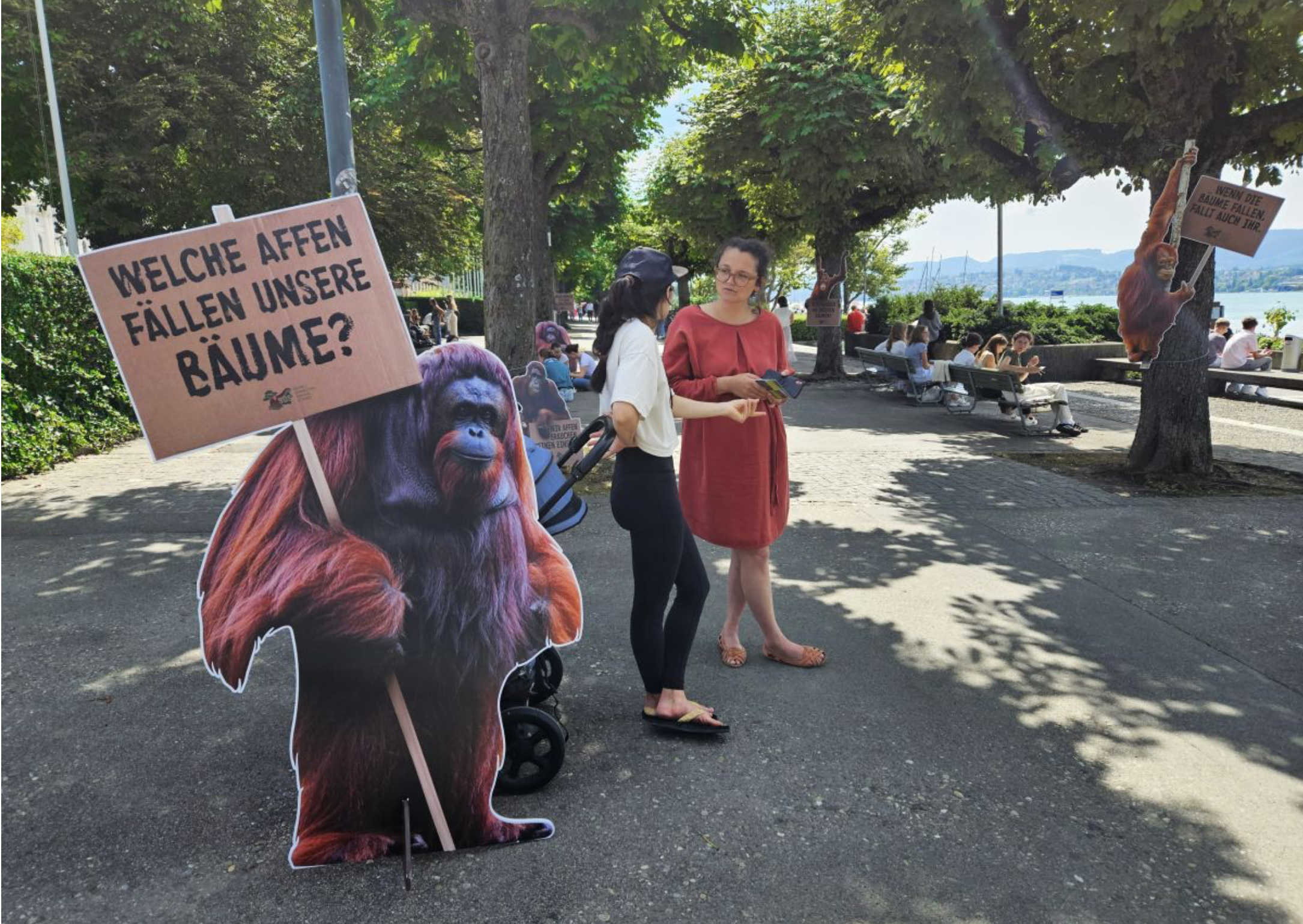 Am Welt-Orangutan-Tag werden die Passantinnen und Passanten am Zürcher Seeufer von einer Affendemo Aktion überrascht. 2D-Aufsteller von lebensgrossen Orang-Utans schaffen Aufmerksamkeit für die international agierende NGO BOS und die schwierige Situation der vom Aussterben bedrohten Primaten.